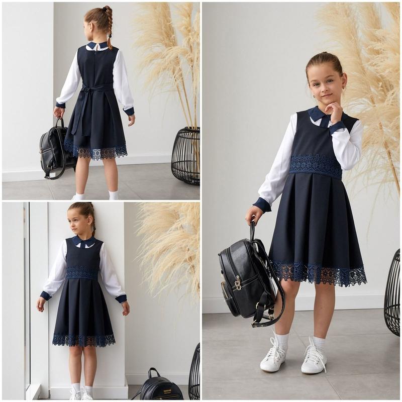 Шикарная новинка! Школьный сарафан, ткань костюмка и кружево Сзади на молнии и поясок пр-ль Украина Длина / ПОГ р.128 70см/ 33см р.140 76см/ 35см Погрешность +- 2см