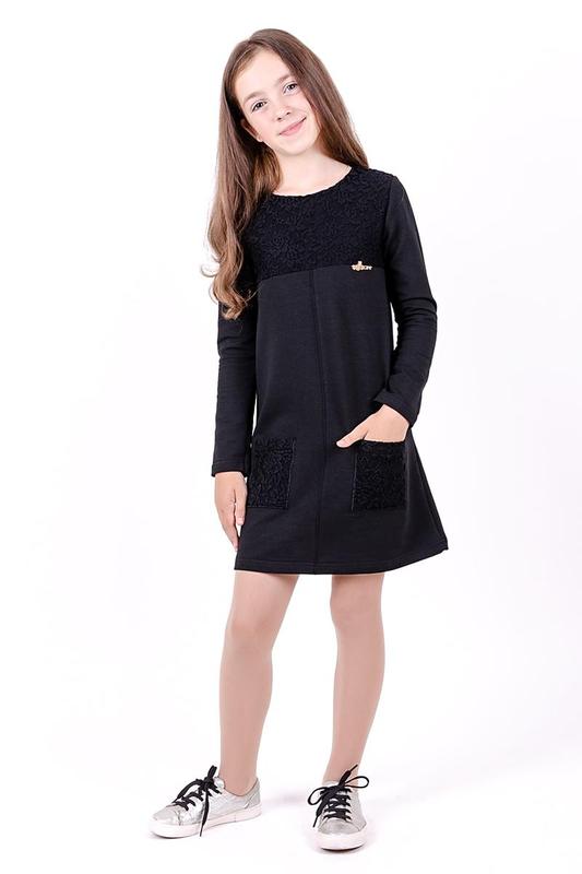 Стильное черное платье подойдет для ежедневного использования и праздничных мероприятий. Предусматривает длинные втачные рукава и круглую горловину. Модель свободного кроя имеет карманы и кокетку, декорированную красивым гипюром. Изделие подходит для прохладного времени года. Модное платье сшито из двухнитки: в состав такого полотна входят хлопок и полиэстер. Материал мягкий, приятный к телу, не кашлатится, не линяет и отлично сохраняет форму после многократных стирок.