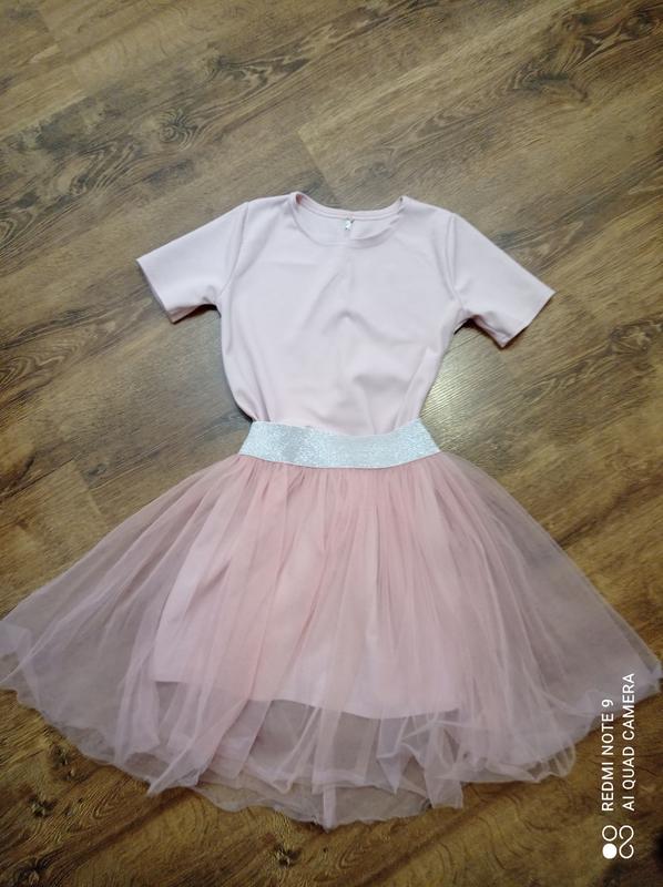 Плаття + спідниця. Колір світло рожевий, пудра. На ріст до 140. Можна носити як разом , так і окремо. Має одну невелику затяжку, якщо перетягнути назад, то навіть не буде замітно.
