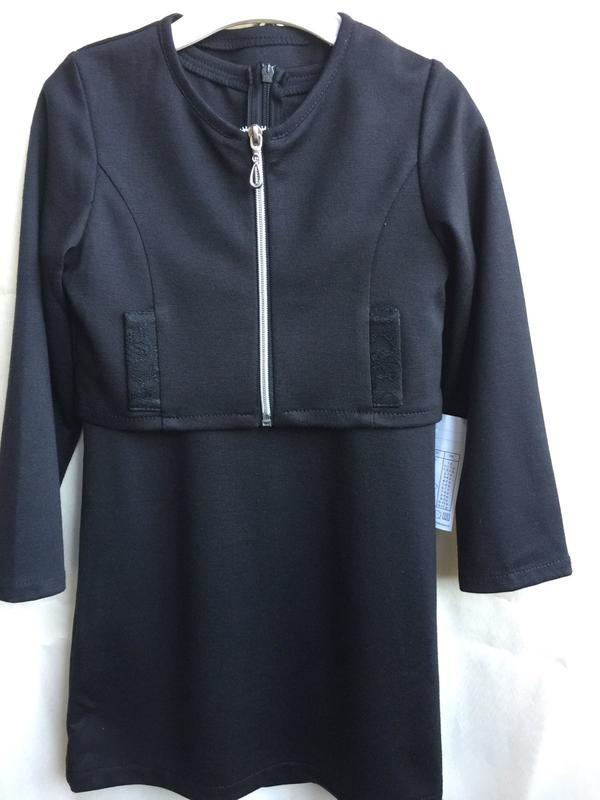Трикотажное платье -сарафан с жилетом размер 110 116. Украина цвет черный . Платье на груди украшено кружевом. На спинке молния Ширина груди 30 см длина 58см. Жилет ширина груди 31 см рукав 39см