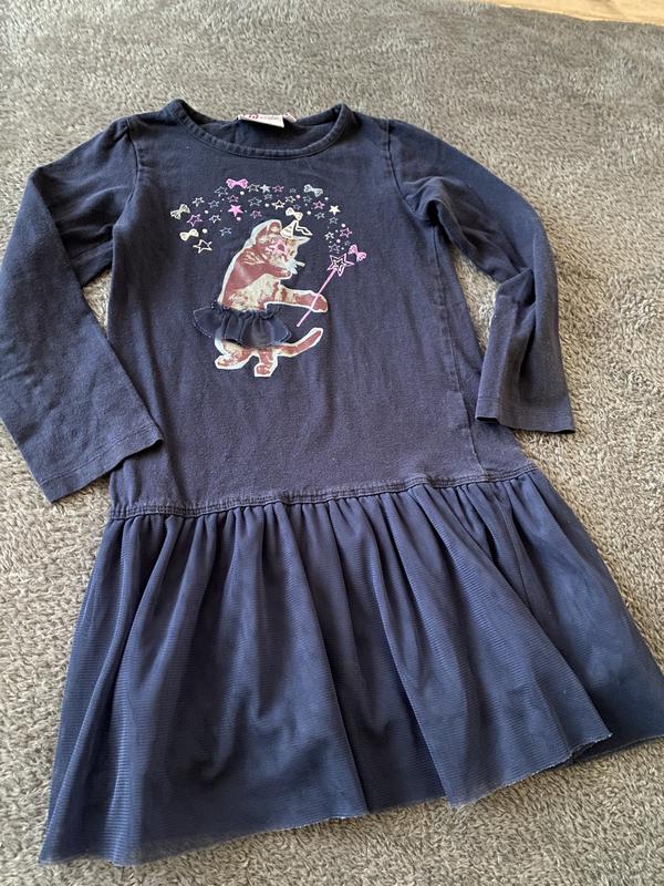 На теле нет)воротник круглый,рукава длинные,впереди рисунок «котик»снизу широкая фатиновая рюшка) Длина 59 см) Плечи 25 см) Пог 30 см) Поб 32 см) Рукав 38 см) Низ свободный