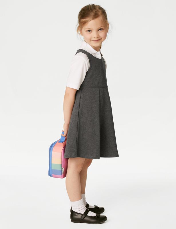 Школьный сарафан M&S на 5-6 лет на р.116 и на 6-7 лет на р.116/122. Этот набор из двух сарафанов с высоким содержанием хлопка дополнит детские повседневные вещи. Этот стиль без рукавов легко надевается поверх рубашки или поло, поэтому его можно носить в течение всего года. В комплекте с вставками из джерси. Изготовлен из органического хлопка. Состав. 85% хлопок, 15% полиэстер.