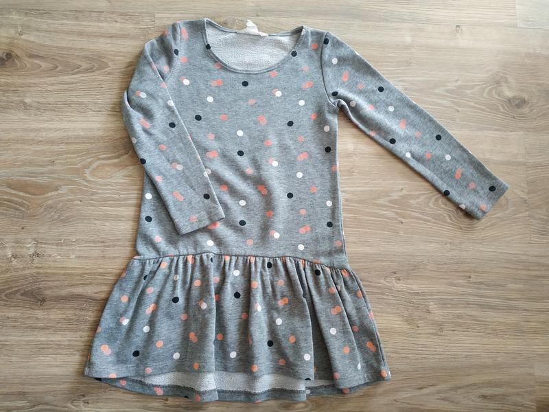 размер 4-6л, 110-116 некоторые Горошки немного потрескались, в носке не очень заметно и есть маленькое пятнышко на рукаве