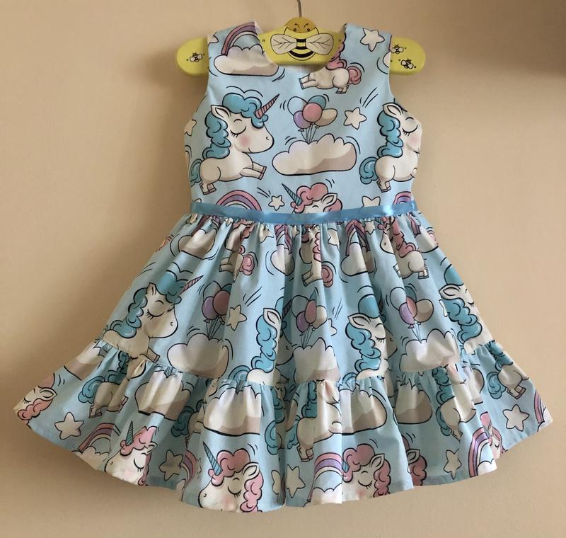 Продам новое платье единорог. Размер 98-104, пог 30 см, общая длина 55 см. Ткань хлопок, лиф на хб подкладке, сзади потайная молния, на талии утягивается пояском .