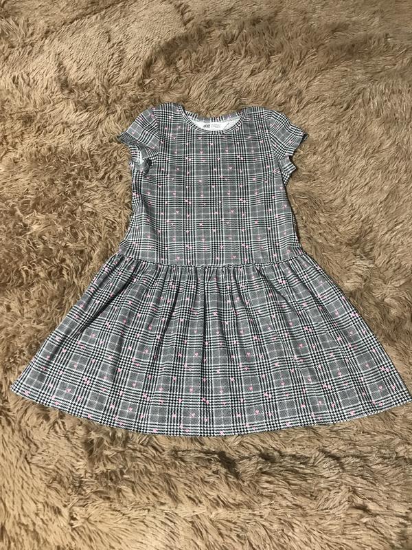 Красивое платье от H&M, принт гусиная лапка и сердечка. Размер указан 6-8. Думаю большемерит, дочь носила при росте 128-134. Ориентируйтесь пожалуйста на замеры: Длина - 69 см; Плечи - 28 см; ПОГ - 33 см; ПОТ - 35 см. УкрПочтой не отправляю. Отправка товара ТК Новая Почта наложенным платежом без предоплат. Кому удобно - можно на карту ПриватБанка. Нахожусь в пгт Доманёвка. Николаевская область. Пишите, буду рада).
