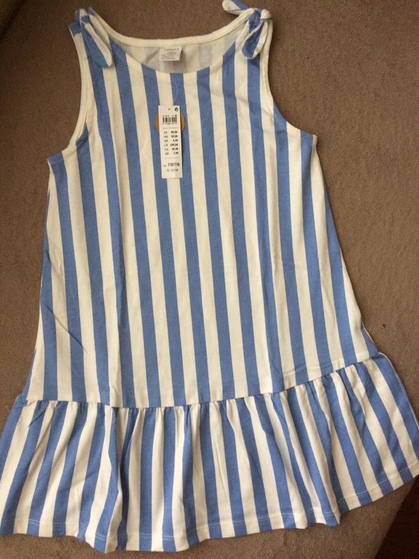 Стильна смугаста сукня Lindex р.110-116. Декоративний бант на плечах, розширений фасон, дуже приємна до тіла, маємо інші такого ж розміру, донька носила їх із задоволенням. Довжина від плеча 61см, під рукавами 33см.