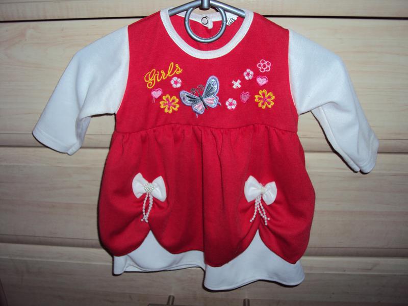 Червоне з білим платтячко. Довжина 37 см, довжина рукавчика від плеча - 20 см, на спинці три кнопки, вказаний зріст 80 см. Стан ідеальний. Додам моднячі капронові колготочки у подарунок на вік 3- 6 місяців