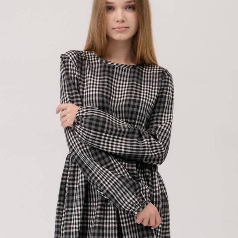 Стильное платье из клетчатой ткани. Отрезное по линии талии. Юбка слегка расклешенная за счет мелких складочек. Имеет классическую расцветку и красиво ложится. Рукава свободные; заканчиваются узкими манжетами с защепами возле них.