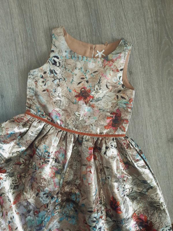 Очень красивое !!! нарядное платье золотистое в цветочный принт. Длина 68 ПОГ 32.5 ПОТ 30 Плечи 24
