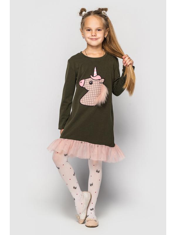 Сукня вільного крою з обробкою з сітки, нашивка у вигляді поні. Склад: 50% бавовна, 45% віскоза, 5% поліестер Колір - хакі. Є в інших кольорах, запитуйте. Розмір: 80-86, 86-92, 92-98