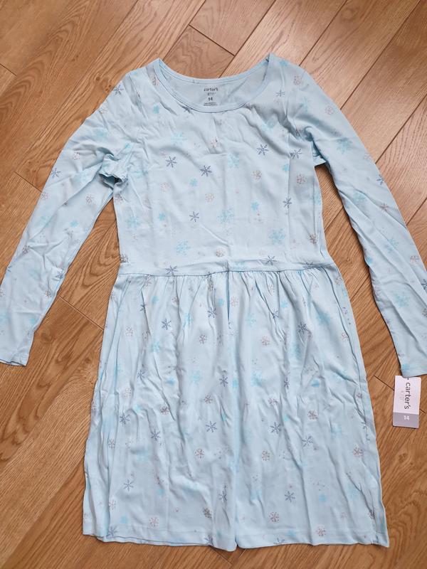 Красивое трикотажное платье, ф. Carters, р. 14 на рост 155 см. Рисунок - снежинки, цвет голубой. Новое с бирками