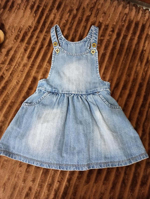 Очень красивый джинсовый сарафан в идеальном состоянии без дефектов. Длина максимальная 50 см., есть вторая пуговка можно сделать короче. По талии 27 см., есть сзади резиночка,хорошо тянется. Размер указан 86-92,но можно спокойно носить и до 98.