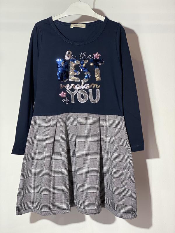 Платье для девочки 6 лет 116 см комбинированного цвета, синий верх и низ клетка, фасон трапеция, спереди аппликация пайетками. Замеры: длина 62 см, рукав 42 см.