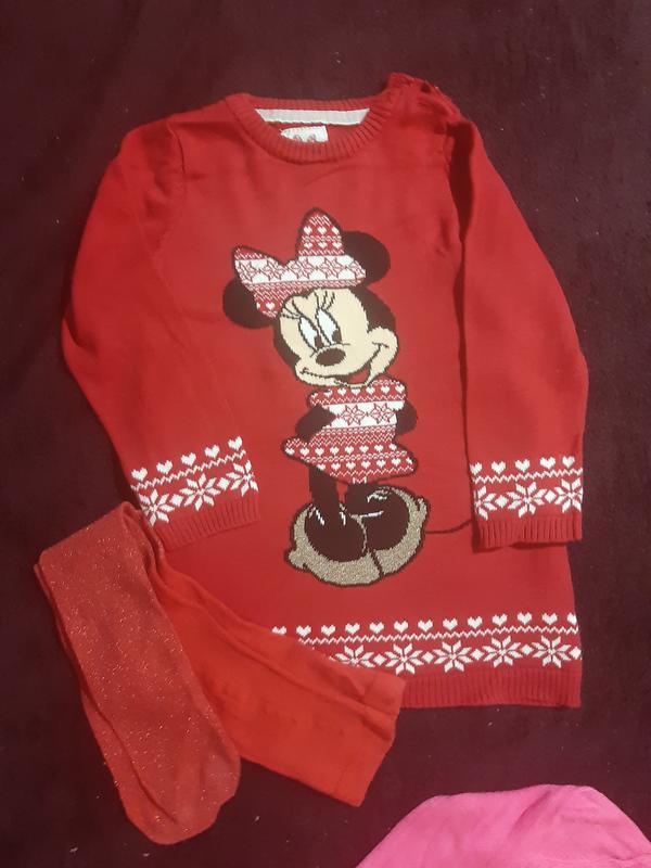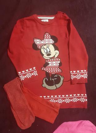 Теплое нарядное платье с Минни и люрексовые колготки в тон на 2 года