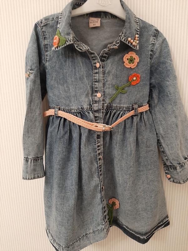 Красива джинсова сукня, з елементами вишитих квіток,рожевий поясок, рукавчик можна робити четвертним. Довжина 51 см Довжина рукава 33 см.