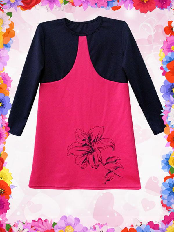 Платье для девочки из французского трикотажа.Красивая комбинация цвета, декор-шелкотрафаретная печать. Размер 122-128: длина 67 см., ПОГ 35 см., длина рукава от плеча 42 см. Размер 128-134: длина 69 см., ПОГ 37 см., длина рукава от плеча 43 см
