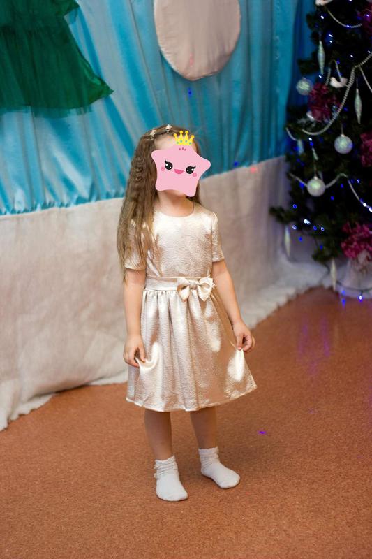 В идеальном состоянии. Одевалось два раза. На 5-7 лет. Длина 60см,ПОГ 31см. Цвет золотистый