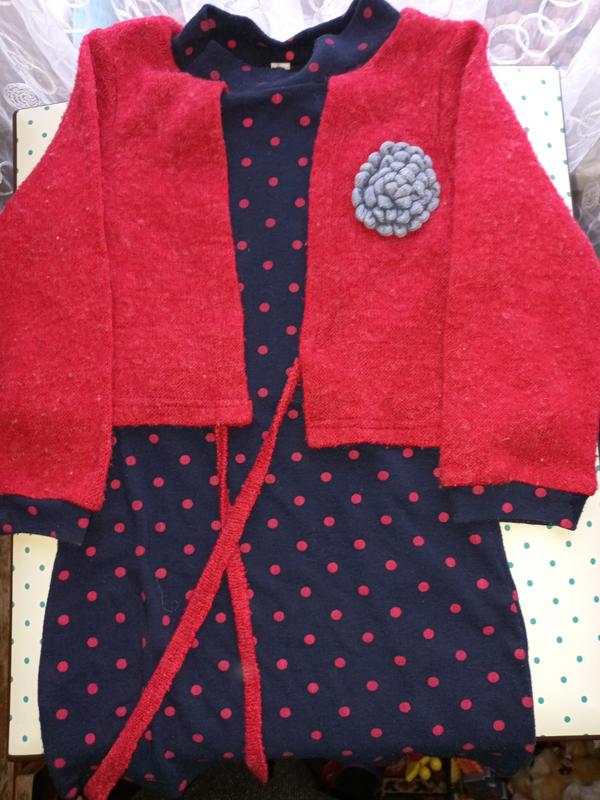 Трикотажное платье. С пришитой жилеточкой. Очень теплое и приятное. На возраст 2-3.5 года. В очень хорошем состоянии