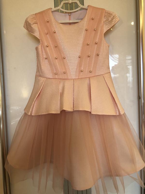Очень нарядное и красивое платье для девочки. Украина фирма Mevis/ Цвет нежно- персиковый. Ткань приятная комфортная к телу с красивым рельефом. Верх платья украшен фатином с бусинками. Юбка первый слой атлас ,второй слой фатин. Размер 98 ширина груди 27-28 см длина 52 см. Размер 116 ширина груди 30 см длина 62 см