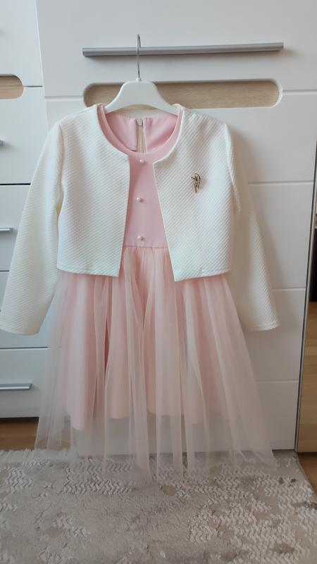Платье нежно-розовое в идеальном состоянии, рост 116см. Короткий рукав, двухслойный фатин, в комплекте с пиджачком. Замеры: ПОГ - 30см ПИТ - 29см Длина по спинке - 67см