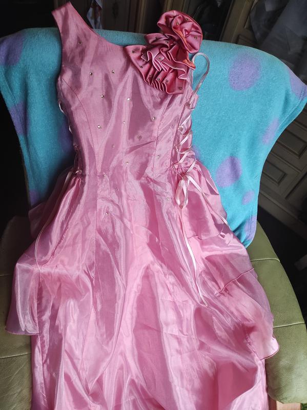красиве довге плаття для дівчинки. по боках корсета шнурівкою можна регулювати розмір, тому підходить дівчинці від 116см до 140 див. задня частина спідниці волани. на ліфі стрази. на лівому плечі прикраса зі стразами. застібка блискавка