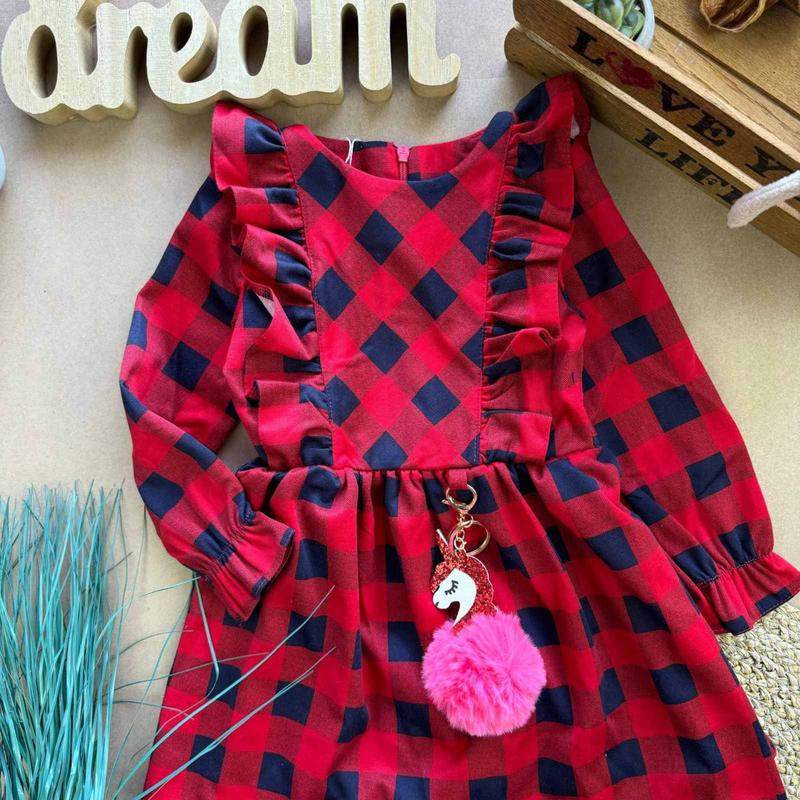 Стильна сукня у клітинку! Якість- люкс. Неймовірно стильна. Рукава- призібрані на резинці. Спереду- прикрашено рюшами. Сзаду застібка та пояс. Тканина- французський трикотаж. Розміри: 98 – рукав 34 довжина 51 104 -36/54 110 – 38/56 116 – 41/58 122 – 43/61 *Брелок може відрізнятися від фото.