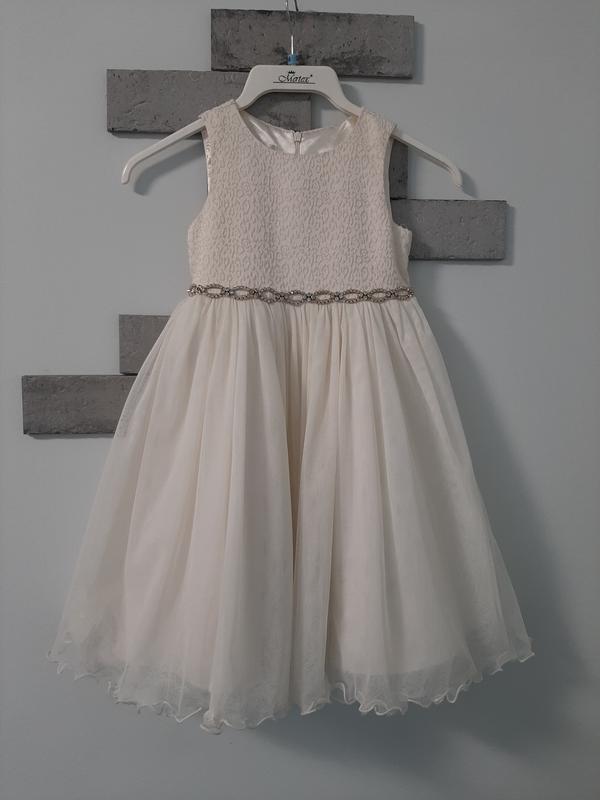 Дуже гарне плаття,верх сукні набивний шовк,низ фатін .Спідниця в міру пишна,два подьюбника, які створюють невеликий обсяг.Довжина 66 див. Прикрашене стразами на завищеної талії,піт 30см.,зав'язується тонкими стрічками щільними На спині блискавка 33 див. тому дуже зручно одягати дитині.