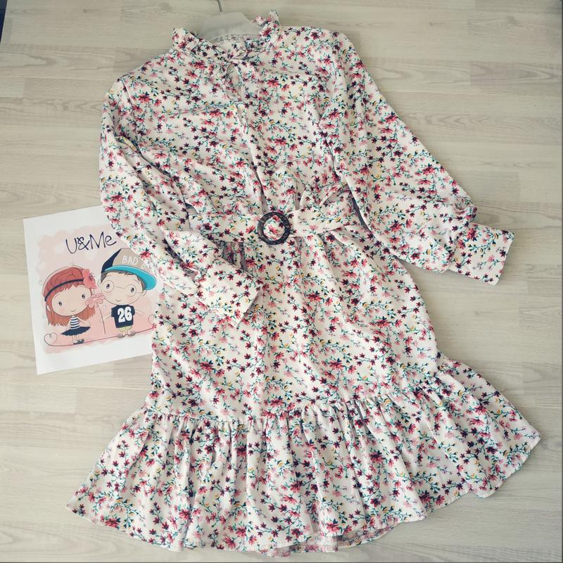 Невесомое, воздушное платье для любого события. Наши модницы оценят Ткань шпатель, достаточно плотная, но тонкая и легкая, очень приятная на ощупь, не просвещается, хорошо пропускает воздух. Воротник стойка, есть завязки Манжеты имеют форму(проклеены флизилином), в талии вшита резинка, + в комплекте идет сьемный поясок Основной цвет молочный + цветы замеры: размер/длина/пог/рукав/талия в розтянутом состоянии 128р/63/38/55/38