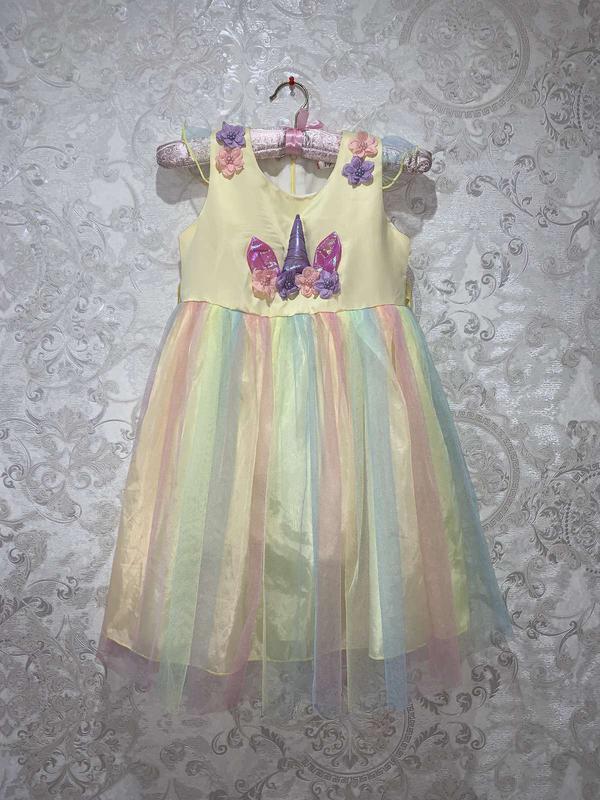 Шикарное платье Единорога + обруч в комплекте Длина 79.5 ПОГ 36-36.5 ПОТ 35 Сзади молния и пояс. Платье полностью на тонкой хлопковой подкладке) Примерно на 8-10 лет См.по замерам.