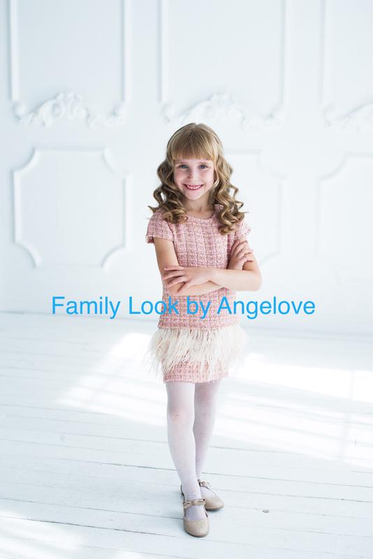 Сукня з твіду, прикрашений страусиним пір'ям. Підклад батист 100% бавовна. Ціна вказана ща дитяче плаття в розмірі 110 див. Вартість інших розмірів уточнюйте, будь ласка. Можна придбати окремо костюм для мами.