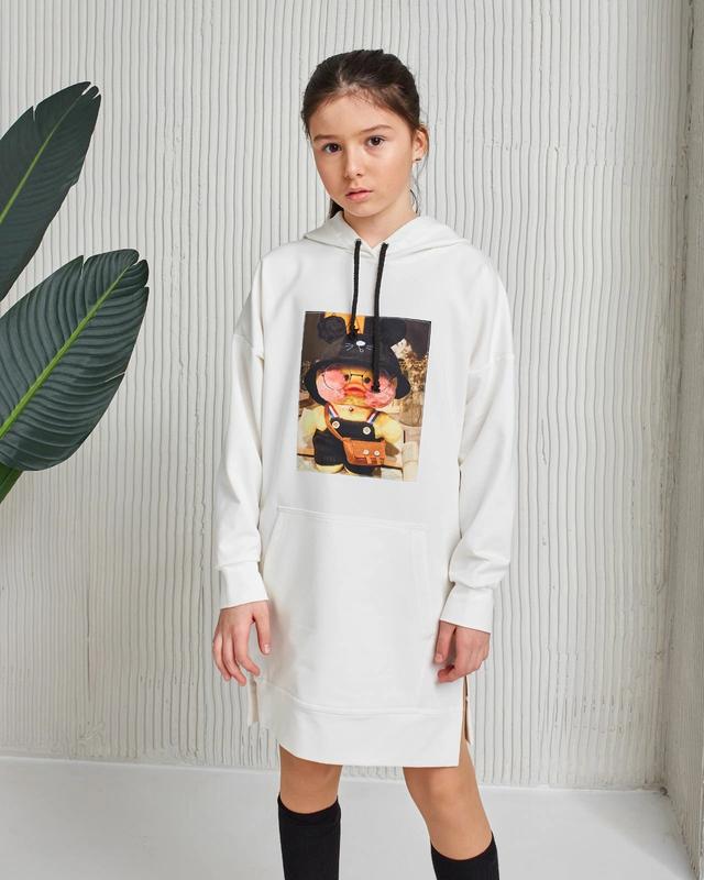 Хит сезона!!! нашумевшая уточка платье-туника с капюшоном и карманом кенгуру ткань качественная двунитка пенье катышам стоп! уточка-нашивка на каждой расцветки будет своя в соответствии с цветом СУПЕР КАЧЕСТВО!!!! ирис размеры 122-152