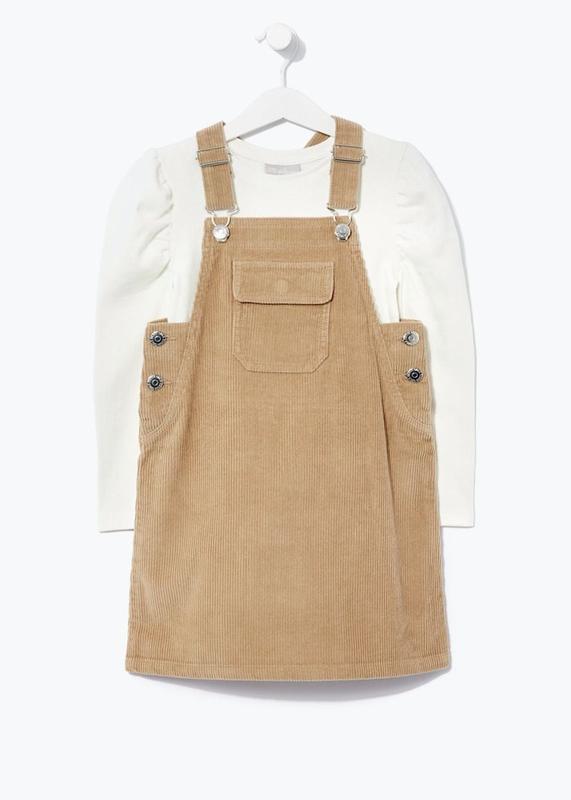 Милый комплект-двойка для девочки. Состоит из сарафана и реглана. Сарафан из вельвета, с бретелями (регулируются). По бокам - пуговици для большего комфорта. Спереди накладной карман. Реглан трикотажный, с длинным рукавчиком, круглый вырез горловины. Состав: реглан: 97% хлопок, 3% эластан; сарафан 100% хлопок.. Розмір Довжина з бретелею (максимально відрегульована) Ширина в поясі Довжина реглана від плеча Ширина під руками Довжина рукава від плеча 6 років 64 см 31 см 41,5 см 30,5 см 39 см 7 років 66 см 34 см 42,5 см 33 см 41 см 10 років 76 см 38 см 49 см 37 см 53,5 см
