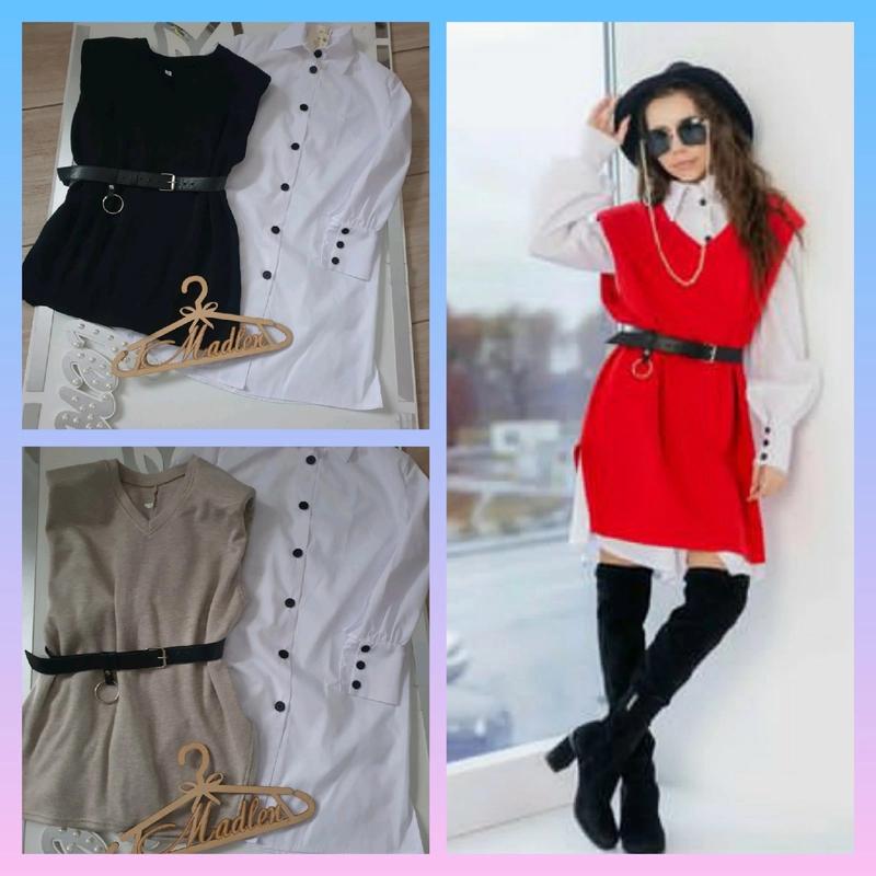 НОВИНКА Трендові сукня-сорочка (тканина х/б) + жилетка на подплечниках (тканина ангора двостороння)+ поясок в комплекті. Якість відмінна! 140р(1шт) довжина сорочки 80,пог 47, рукав-50, довжина жилета 69, пог 49 146р (1шт) довжина сорочки 83,пог 47,рукав-53,довжина жилета 72,пог 51 152р(1шт) довжина сорочки 87,пог 48, рукав 56, довжина жилета 75, пог 53 158р (1шт) довжина сорочки 90,пог 49,рукав 58,довжина жилета 77,пог 54 164р(1шт) довжина сорочки 93,пог 51, рукав 60, довжина жилета 80, пог 55 ціна 645