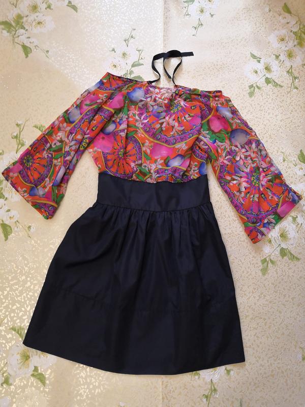 Сукня gVaisal, new collection, розмір 38. Збоку блискавка – застібка, ззаду – зав'язки. Довжина 84 см, довжина спідниці з бокового шва від талії 47 см, рукав від шиї 38,5 см, напівобхват талії 31,5 см (ззаду в поясі є гумка), низ – вільний. Є ньюанс: по шву всередині трішки прошито, аде не помітно, дивіться останнє фото. Сукня виглядає красиво.