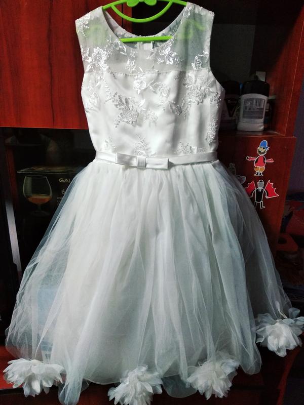 Белое платья, по подолу украшено цветами. Размер довольно универсальный . С 122 см. до 140 см.