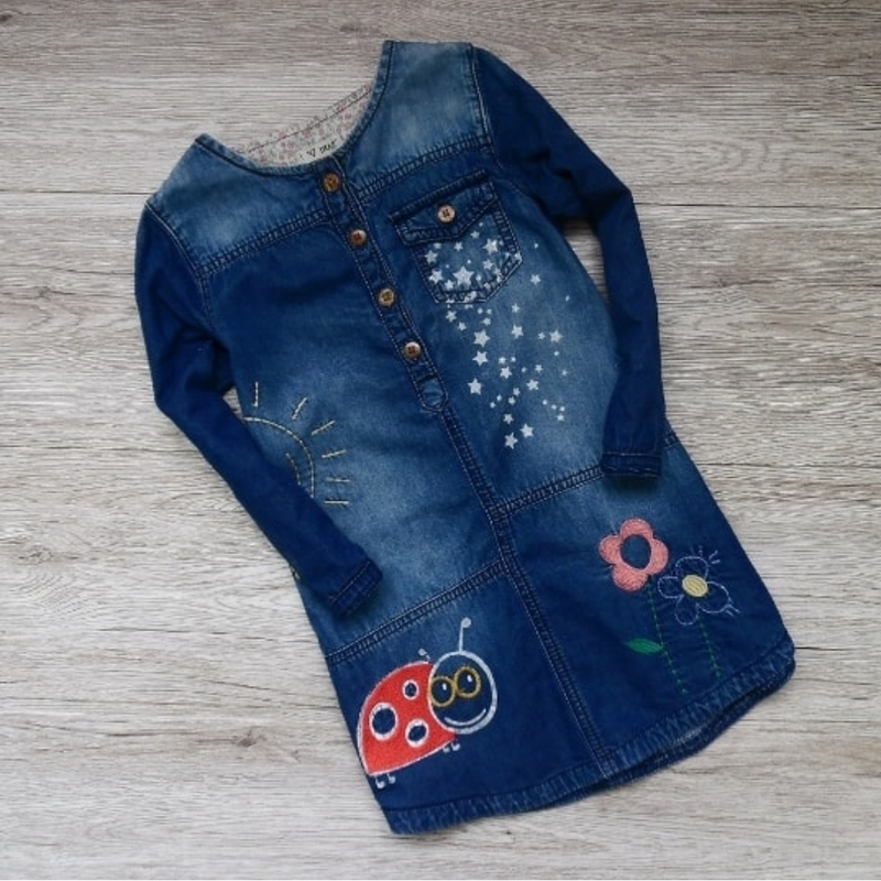 Легкое джинсовое платье Next в идеальном состоянии. Размер указан 2-3 на рост 98 см, но большемерит. Рукав можно носить с подворотом. Замеры: Длина от плеча до низа 55 см Ширина под ручками 31 см Рукав от плеча без подворота 34-35 см.
