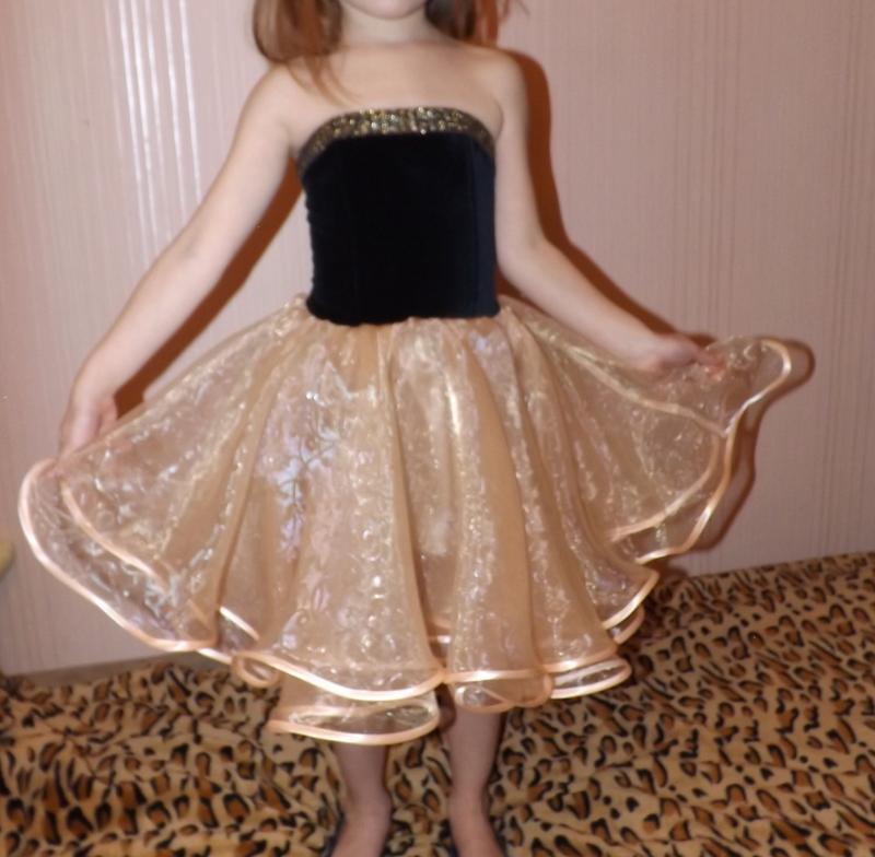Незвичайна сукня: Довжина-50см(по боковому шву), ПОГ-29см, ПОТ-29см. Верх сукні-чорний оксамит, низ -красива бежево золотиста органза. Корсетик без бретелей. Якщо потрібно, то можна пришити.