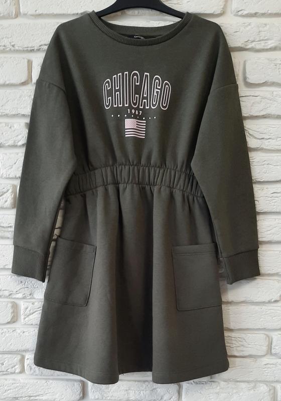 Очень классное платье цвета хакки фирмы George на девочку 6-7 лет (рост 116-122 см.),длинна от плеча 62 см.,ширина от подмышек 35 см.,длинна рукава от горловины 51 см.,на талии сделана резиночка.Ткань платья очень мягусенькая и приятная,утеплена.Состояние новое.