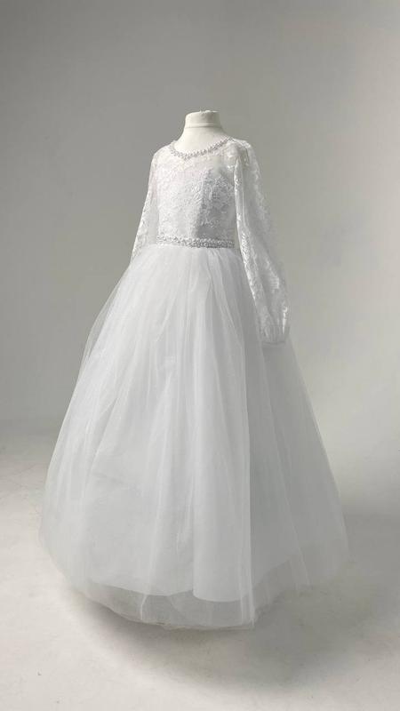 Нарядне плаття до причастя - з єврофатину та мережива шантелье - мереживо з квітами - пишний рукавчик - декорований перлами поясок та горловина Розмір 8-10 р ( зріст 134-146 см) Ліф 72 см в обьємі Довжина 115 см - тканина фатин, атлас, мереживо, атласний підклад гарно виглядає на дитині, є відео