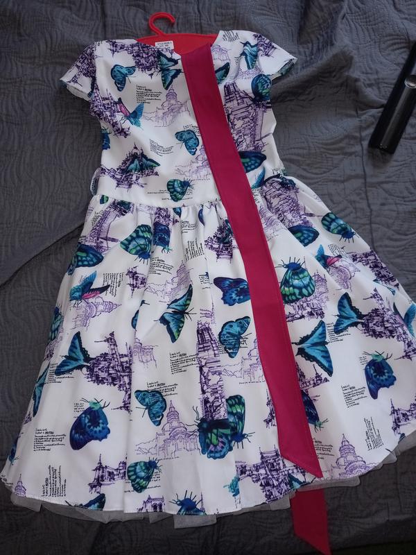 Нове плаття з метеликами,трохи пишне,знизу підкладка з фатіну.З поясом,заді на замку