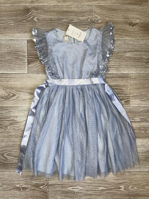 Детское Голубое платье. Полностью блестящее Застёгивается сзади на пуговку Украшено пайетками Завязывается бант на талии. Юбка из 3-х слоев. Новое 🏷Monsoon 9 лет Длина 85(27). ПОГ 37 куплено в оф.магазине 💵1500 грн💵