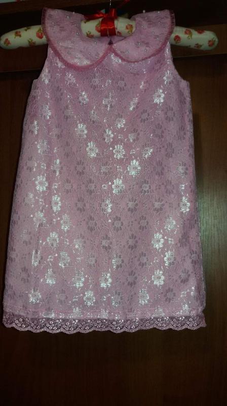 Новое гипюровое платье нежно-розового цвета,круглый воротничек украшен жемчужинками. Платье на подкладке. Длина 55см пог31см