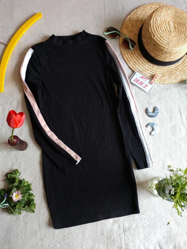відмінний стан. Чёрное трикотажное платье в рубчик с лампасами фирма New Look размер 9 лет будет больше можно использовать как тунику ширина под руками 32 тянется до 42 длина рукава 49 см длина изделия по спинке по максимальным точкам 67 см приятное качество трикотаж 48% вискоза