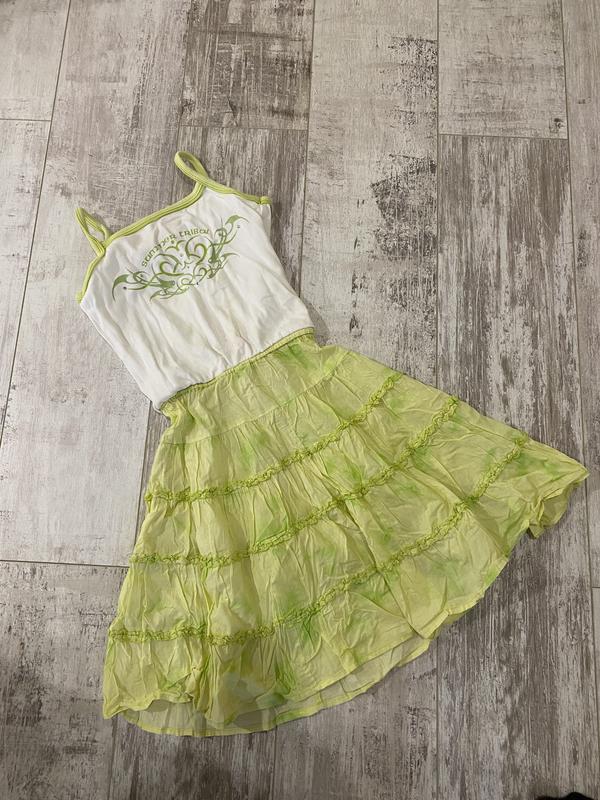 фото на теле нет Бретели тонкие Впереди рисунок с неброскими камешками Юбка с эффектном варенки-стиль бохо-хиппи Подойдёт на 6-9 лет ориентируйтесь по замерам Из нюансов-есть пятна на майке на фото видно (не критично) Длина 78 см вместе с бретелями Пог 34 см) Пот 25 см) Поб 49 см) Снизу 91 см)