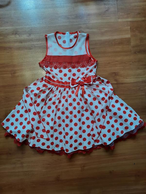 Очень красивое платье в красный горох. Верх с сетчатой вставкой, декорирован кружевом, сзади завязявается на поясок. На поясе бант и стразы, трехслойный пышный подьюпник. Состояние идеальное, одето несколько раз, на рост 134 см. Пишите - отвечу на все вопросы, сделаю дополнительные фото, если необходимо.