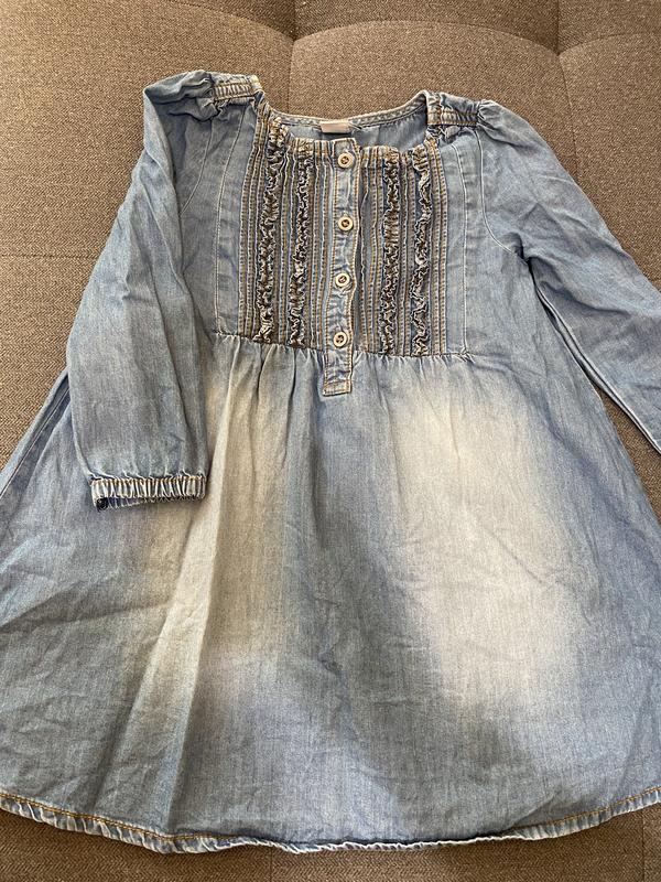 Джинсове сукню оверсайз, розкльошені, на бирці коштує 3-4 роки, але у мене дочка худенька і ми його спокійно одягали в 5 років. На грудях гудзики робітники, дуже легка, тонка і відмінної якості. Дефектів немає