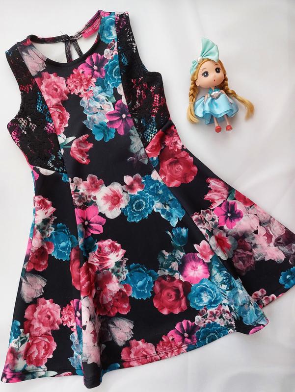 Очень красивое яркое платье в цветочный принт с кружевной отделкой. Сзади застежка на пуговку. Очень удобное. Ткань практически не мнется. По бирке на возраст 2-3 года. Но нам в это время оно было велико. Дочь худенькая, носила в 4-5 лет. Смотрите замеры. Отличное состояние. *** Оплата на карту Приватбанка. Доставка Новой почтой, Justin, Meest, Укрпочтой. Оплата за доставку - при получении. Возврата и обмена нет.
