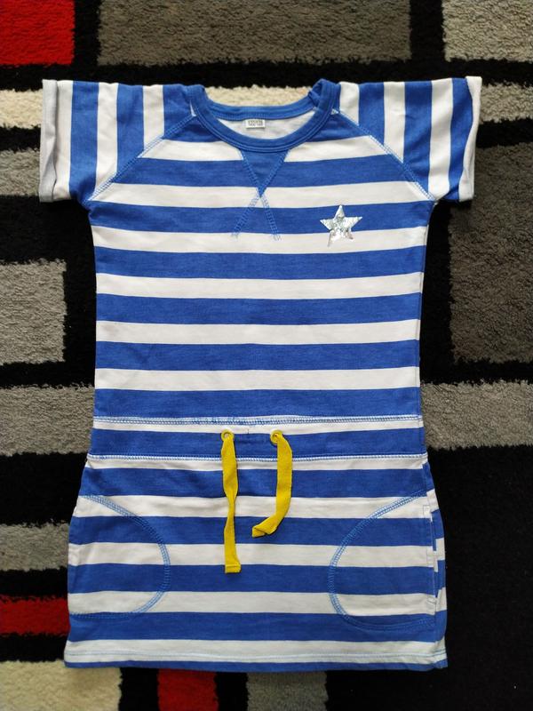 Полосате плаття для дівчинки 6-7 років у відмінному стані. Довжина-61 см,під ручками-35 см.