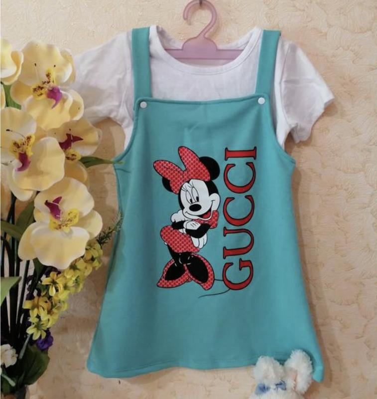 Новый Сарафан прогадала с размером, без футболки. Размер 98-104 Длинна 52см
