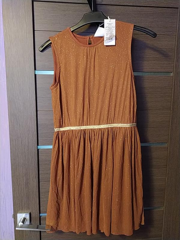 Праздничное фатиновое платье, светло коричневого цвета с блестками, на подкладке, сзади застегивается на пуговицу, по талии вшитая резинка, указанный возраст 13/14 лет, но ориентируйтесь на длину. Состав фатин 95 полиэстер, эластан 5; подкладка 95 вискоза 5 эластан. Замеры длина из фатина 78 (подкладка короче), нот по резинке в спокойном состоянии 36.5,ног39, высота проймы рукава 16.5.